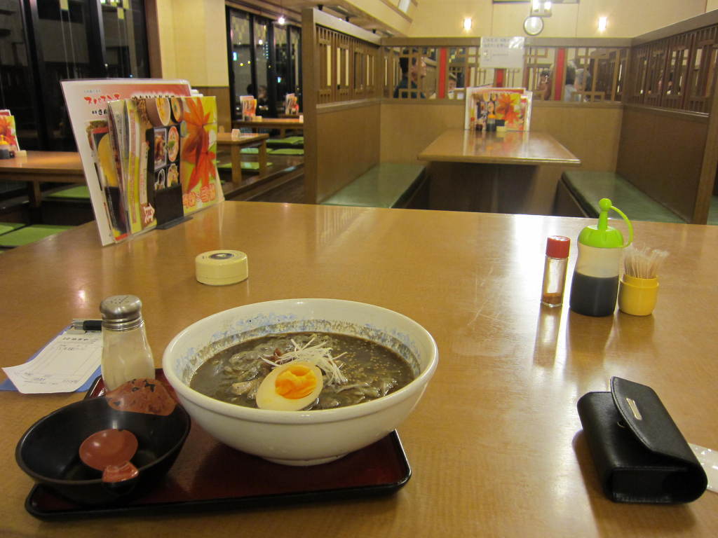 [(사진-44) 온천욕을 마치고 나니 배가 엄청 고픕니다. 오늘 하루 식사는 고작 오카야마역에서 먹은 우동이 유일합니다. 온천안에 식당이 있어서, 800엔짜리 구로(흑)-라멘을 주문하고 완벽하게 비웁니다. 벌써 밤 8시가 다 되어 갑니다]