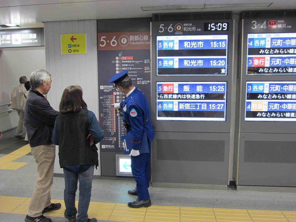 [사진 37] 플랫폼 중앙에는 도요코선, 후쿠토신선 모두 저렇게 역무원이 발판을 밟고 올라가 먼 시야를 확보하면서 안전을 확인하고 통제하고 있습니다.