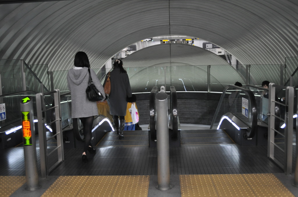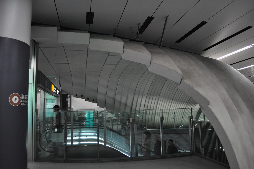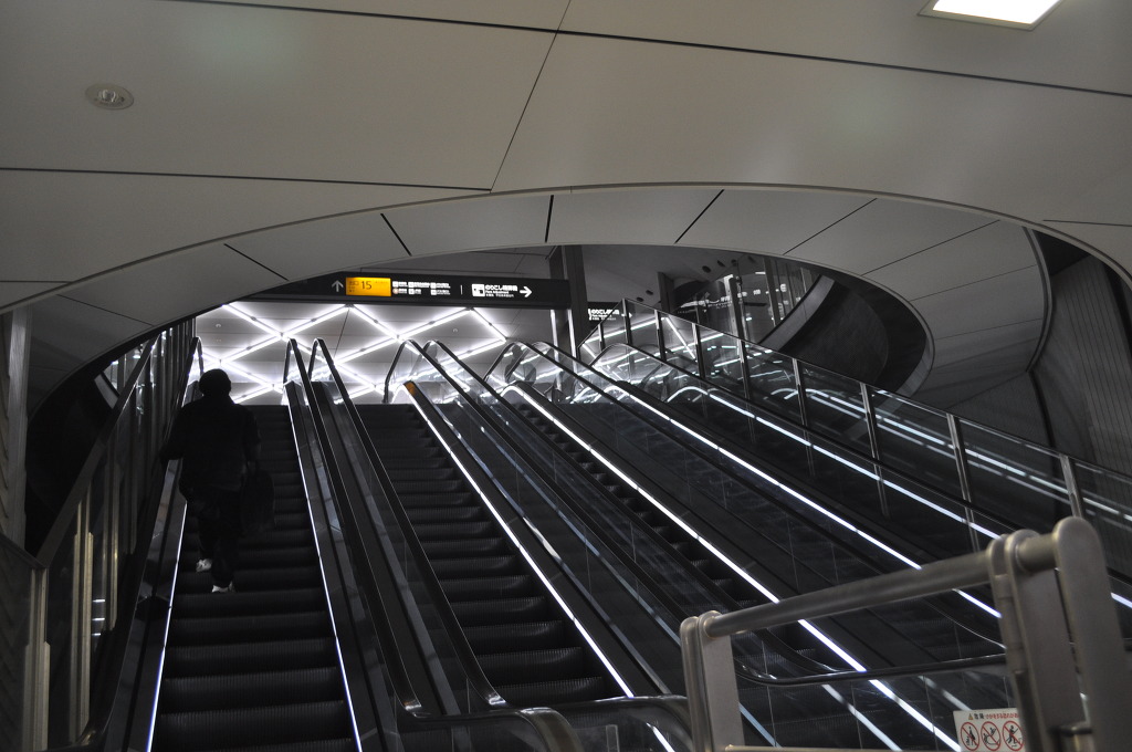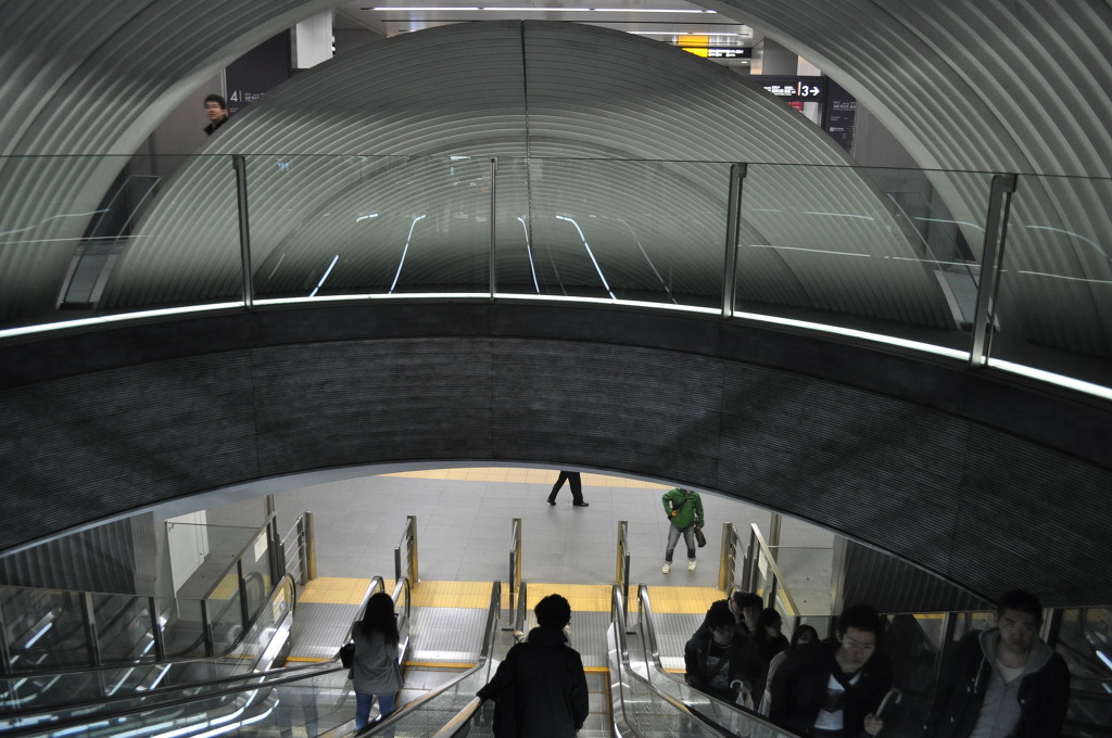 [사진 20] 이제 개찰대를 들어가 봅니다. 저기 앞에는 거대한 소라 구조물 껍질 안에 있는 에스컬레이터가 보입니다. 저 소라 깝질 구조물을 돌아 보기로 합니다.