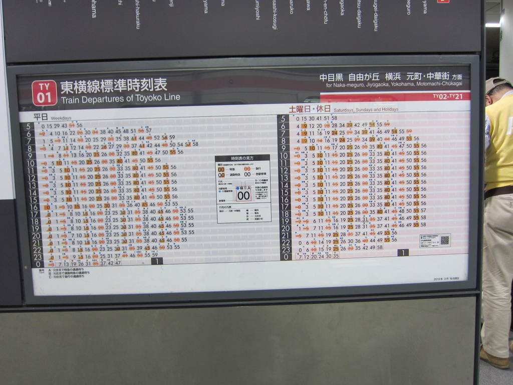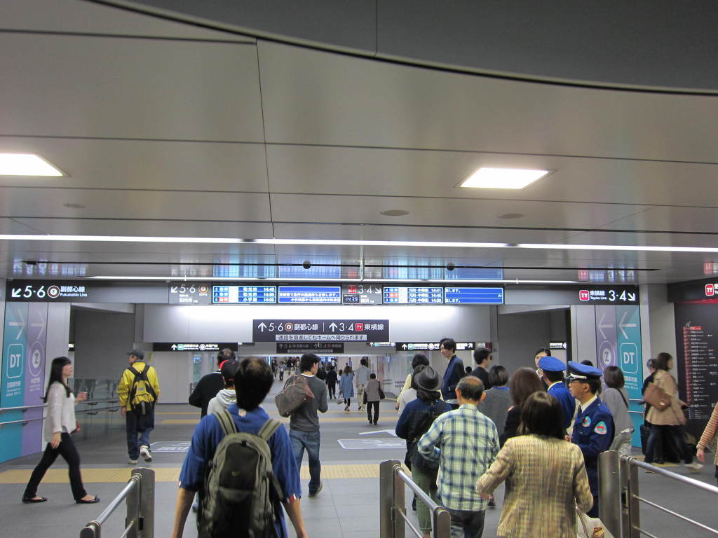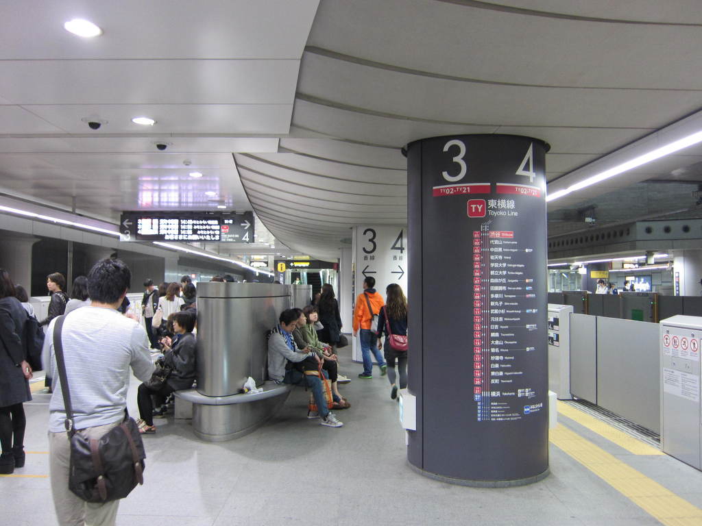 [사진 34] 도요코선의 플랫폼 전경입니다. 비교적 넓은 면적에 양면에서 시발하는 열차들에 모두 쉽게 접근할 수 있습니다. 다양한 정보가 표시된 안내 내용들이 기둥 구조물에도 디자인 되어 있습니다.