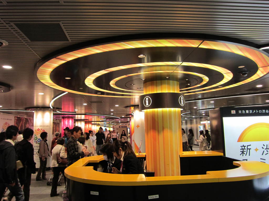 [사진 07] 덴엔토시선 시부야역과 후쿠토신선/도요코선 시부야역 중간에는 별도로 i 데스크까지 설치되었습니다. 화려한 원색 조명의 동심원 디자인들이 눈에 확 띕니다. 시부야의 지상, 지하 모든 곳에 대한 지리적 안내를 해 주고 있었습니다.