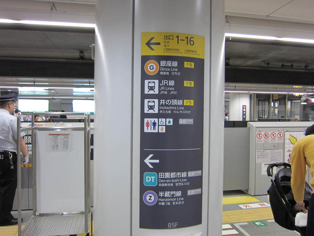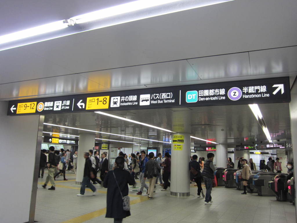 [사진 44] 개찰대 내부에서는 덴엔토시선 방면에 여러 개의 기둥들이 노선 안내가 표시되어 있고, 또 몇 개의 기둥들에는 열차 정보를 표시해 주는 화려한 색의 디스플레이들로 장식되어 있었습니다.