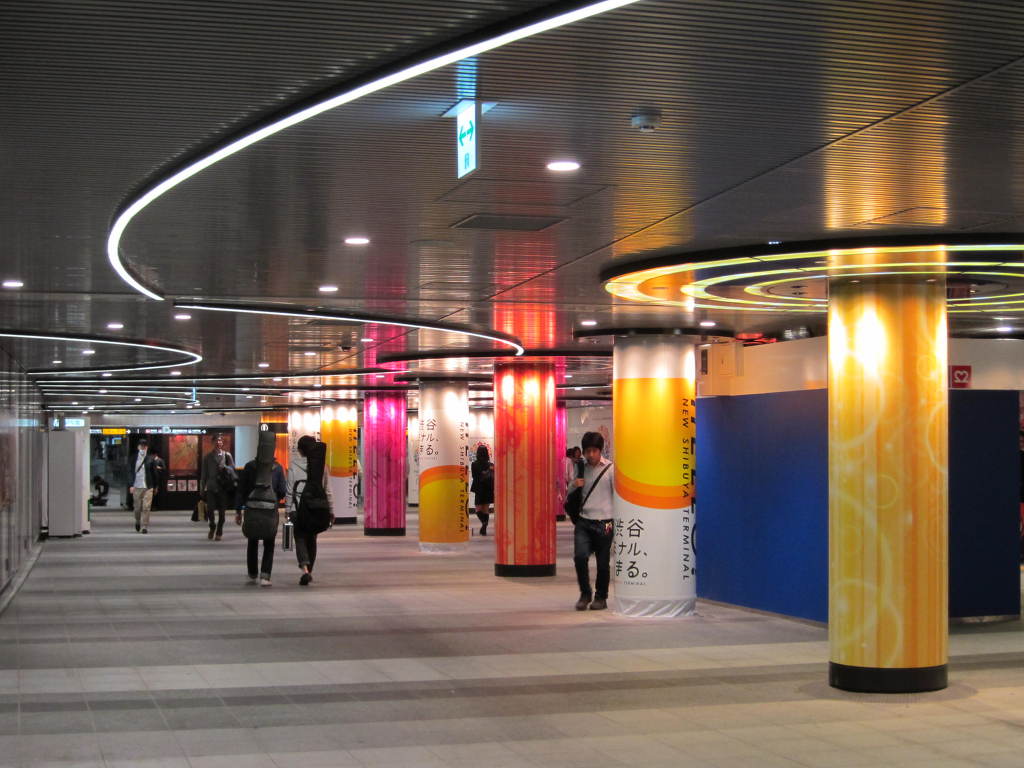 [사진 01] 새로운 시부야역은 혁신적인 철도 시스템 발전과 시부야역을 중심으로 한 차세대형 개발 테마에 걸맞게 미래형 건축을 추구하였다고 합니다. 지하 공간에 기존의 관념을 넘어서는 작은 소도시가 형상화 된 것으로 분석되고 있습니다. 아울러, 기존에 복잡하고 노후된 분위기의 시부야역 지하 구조들이 화려한 색채의 예술 감각으로 변모되었습니다. 저는 모르고 있었는데, Brad님께서 이 역을 설계하고 건축을 담당한 사람이 안도 타다오(安藤忠雄)씨라고 댓글로 주셔서 문헌을 찾아 사진들과 함께 비교, 확인하였습니다.