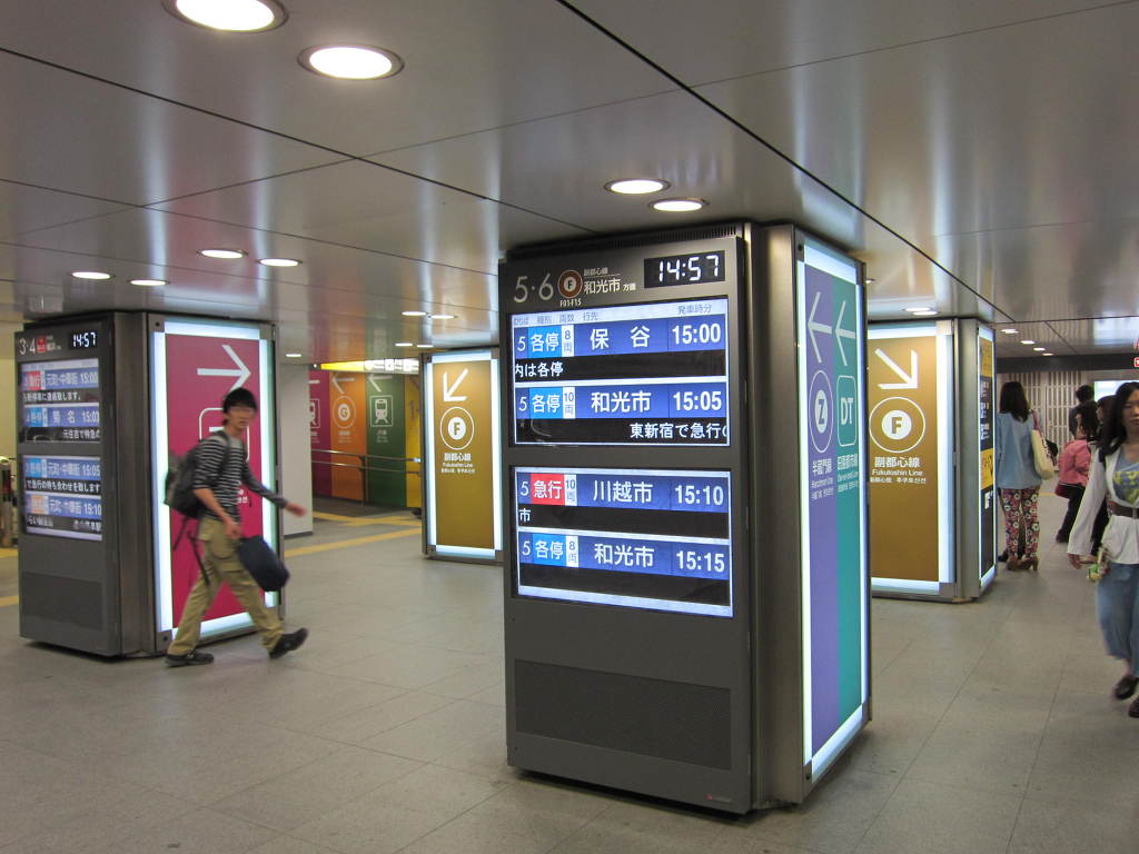 [사진 18] 지난번에 보여드린 것 처럼 3월 16일 이전에는 메트로 후쿠토신선이 모두 사용하다가 이제는 3,4번 홈은 도요코선이 5,6번은 후쿠토신선이 사용하는 표시가 되어 있습니다. 전광판에는 열차 정보들이 4개까지 표시되고 있습니다.