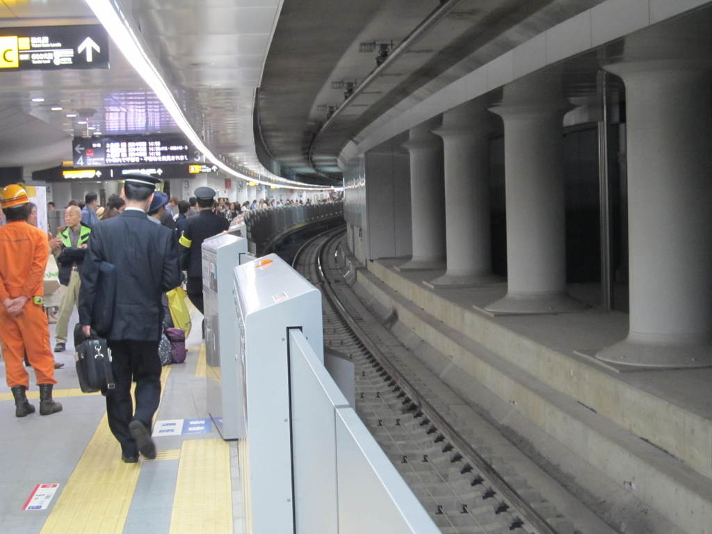 [사진 38] 노란색 완장을 찬 남색 제복의 역무원도 있고, 이 사진에는 없지만 파란섹 제복의 근무자도 있었습니다. 즉 플랫폼에 다수의 역무원들이 상주하여 안전에 만전을 기하고 있었습니다.