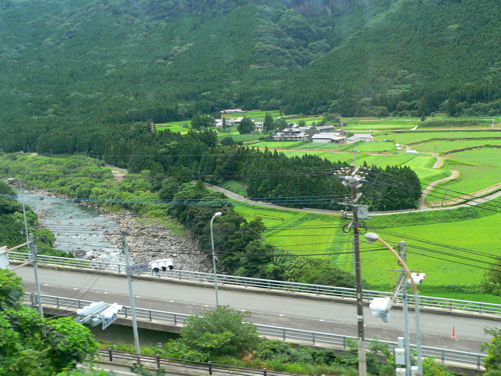 [사진 861] 철로의 아래쪽을 달리는 도로와 산, 하천, 숲, 집, 논이 잘 어우러진 풍경입니다.