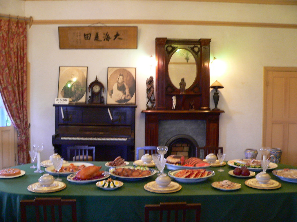 [사진 1660] 붓글씨가 걸려있고 식탁에는 연회식(모형)들이 차려져 있습니다.