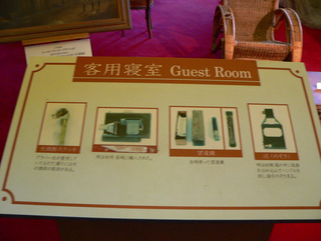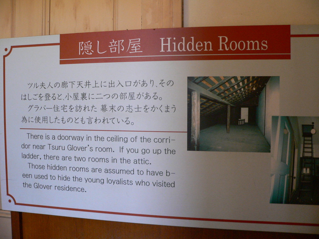 츠루 부인의 방 근처에 이 출입구가 있었으며 위 다락방에는 두 개의 방이 있었고 글로버 저택을 방문한 유신 찬성파들이 숨었던 장소라고 합니다.