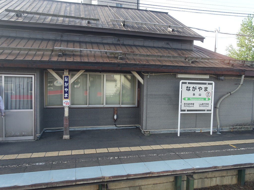 [나가야마역입니다. 2면2선 상대식홈으로 이루어져있으며 하루연간 평균이용객은 486명입니다.]