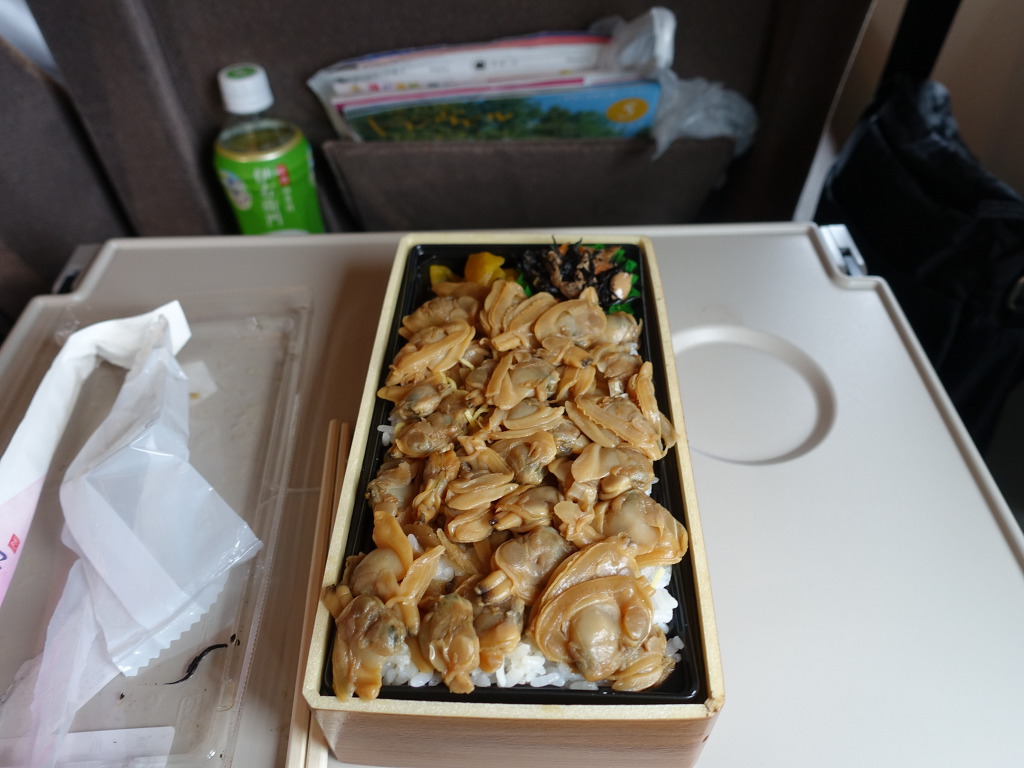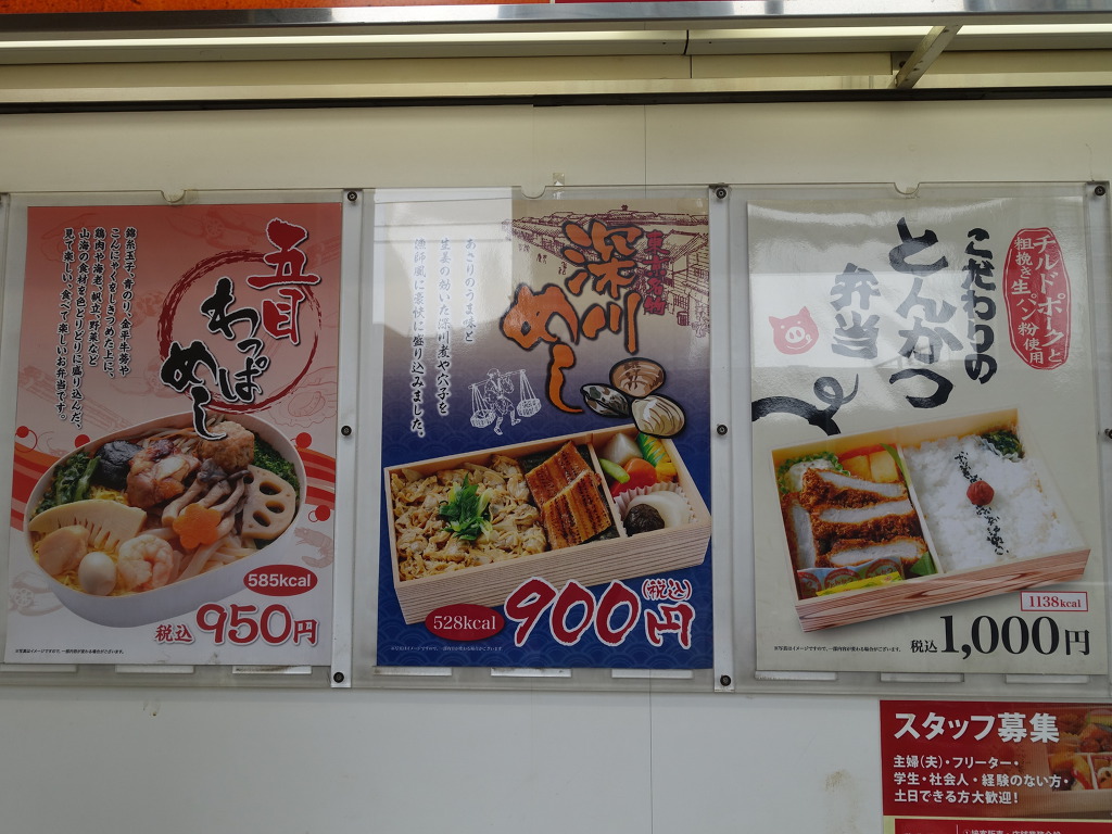 [플렛폼에서도 에키벤을 홍보하고 있습니다. 열차탑승전에 갑자기 마음이 바뀌어서 구매할 수도 있으니까요. 제가 재작년에 먹었던 고모쿠왓파매시(맨왼쪽)도 있네요]