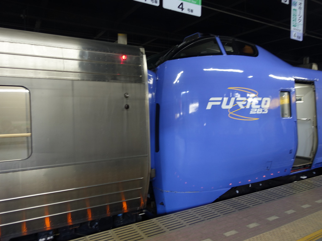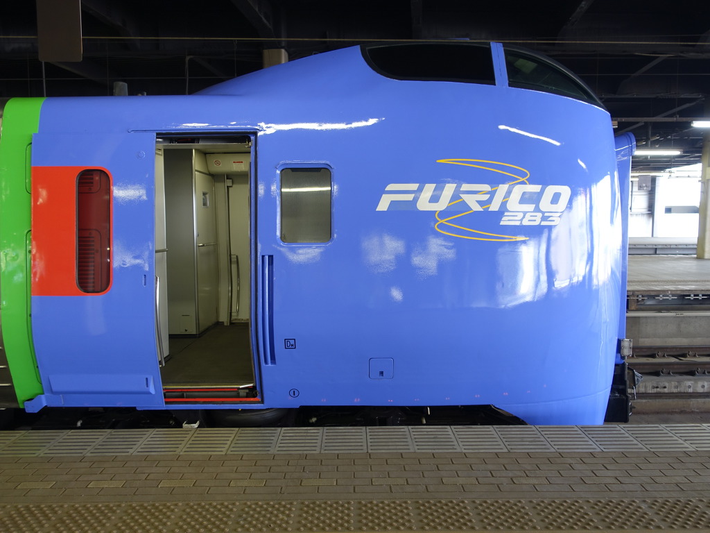 [해당열차가 입선하였습니다. 283계의 로고입니다. 홋카이도 차량답게 운전대가 높습니다.]