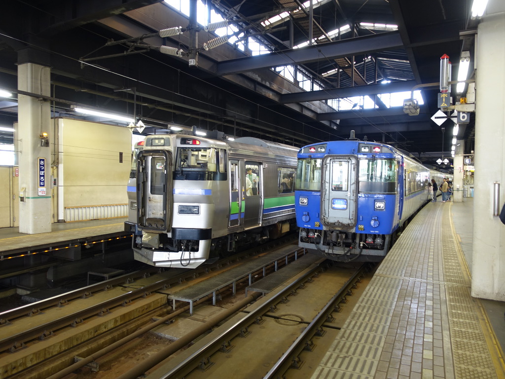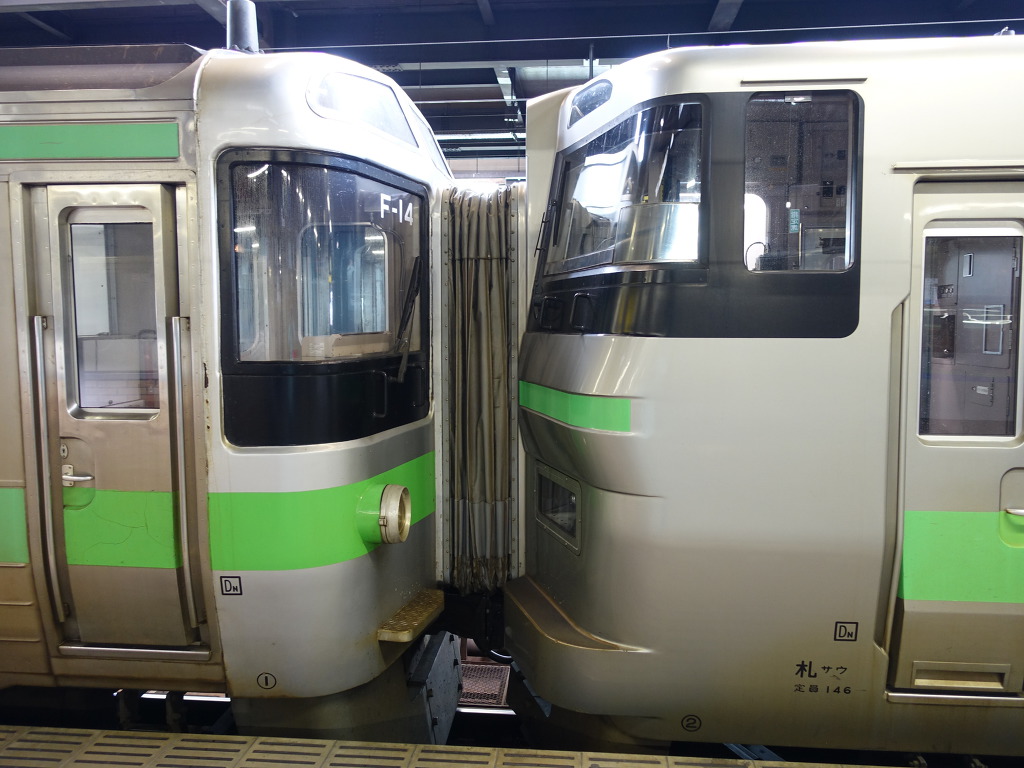 [옆에 733계열치와 특급 호쿠토로 투입되는 183계 열차가 나란히 정차하고 있습니다.]