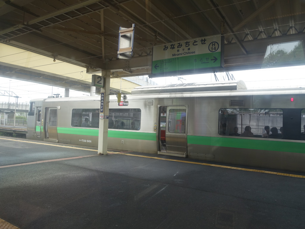 [잠시 미나미치토세역에 정차중입니다. 건너편 733계 에어포트쾌속이 정차해 있습니다.]