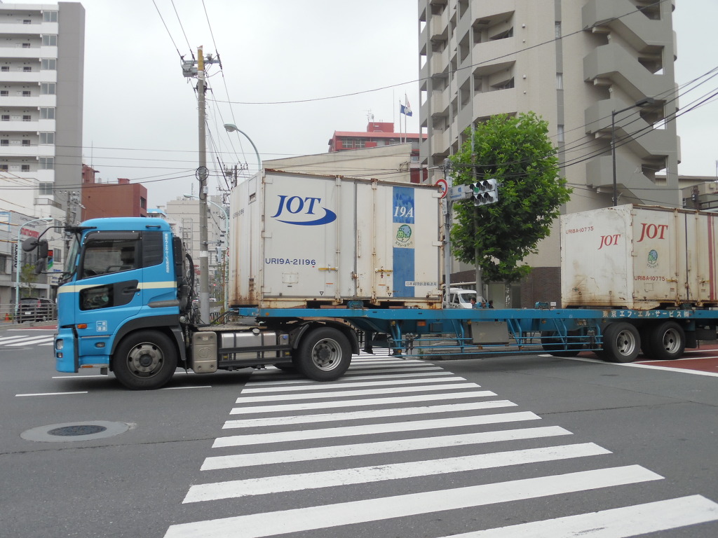 마침 컨테이너를 실은 트럭이 지나가는군요.
