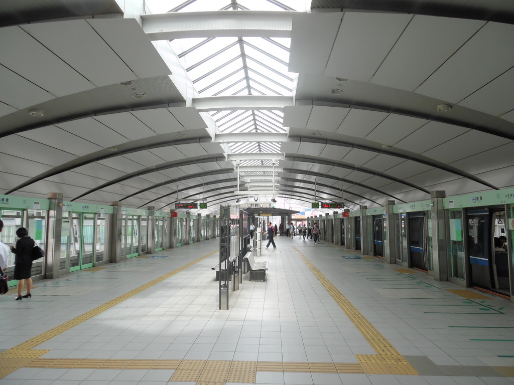 유리카모메 신바시역 승강장. 평범한 1면 2선 섬식 승강장입니다. 제3궤조 형태로 운행하기 때문에 추락 및 감전을 막기 위해 전 구간 스크린도어가 설치되어 있습니다.