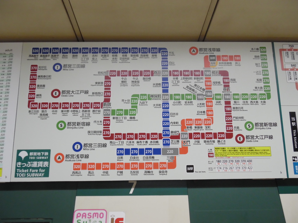 도에이지하철 요금표입니다. 제가 갈 곳은 220엔짜리 구간이군요.