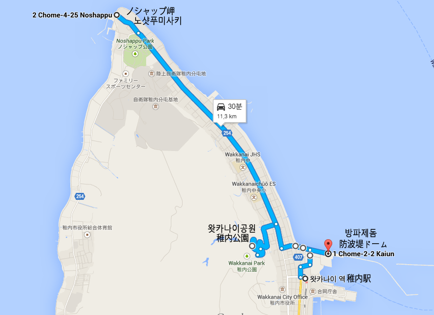 왓카나이역을 출발해서 방파제돔-왓카나이공원-노샷푸미자키-메가솔라-소야구릉-소야곶-칼007편위령탑을 돌아서