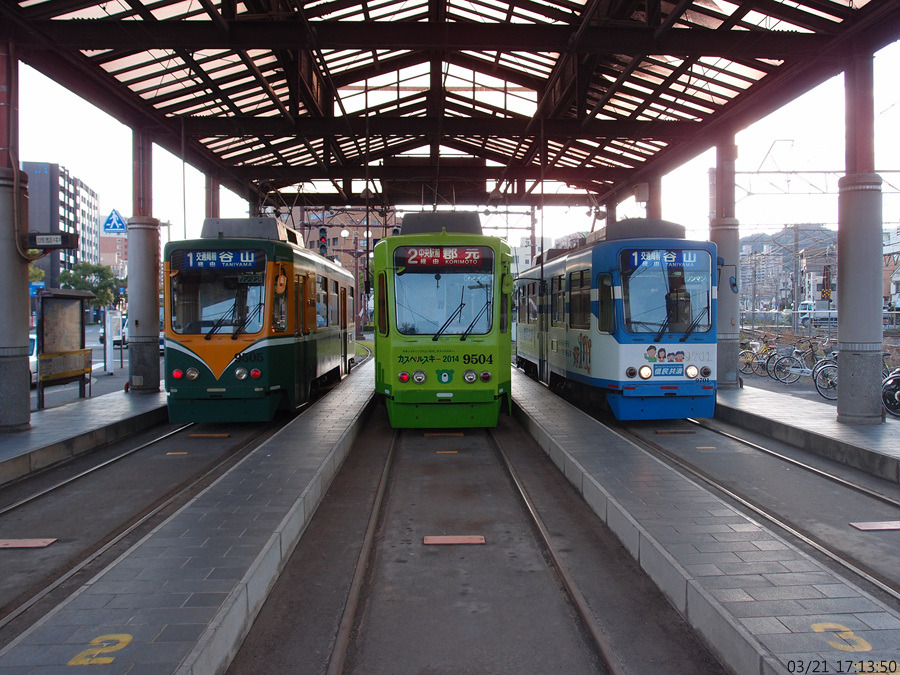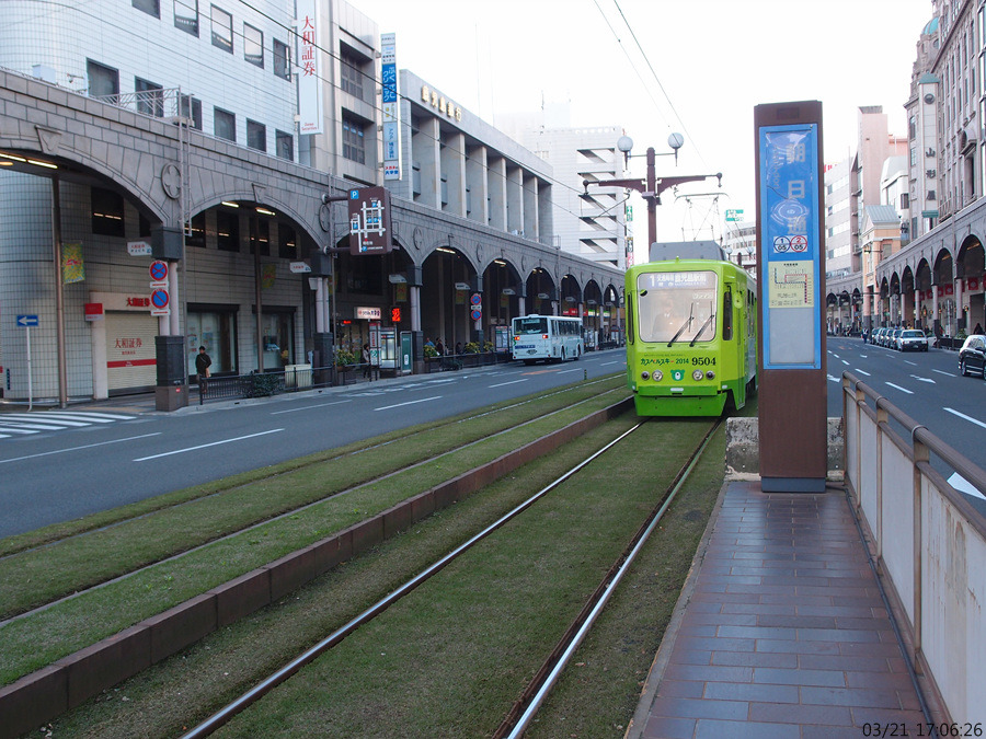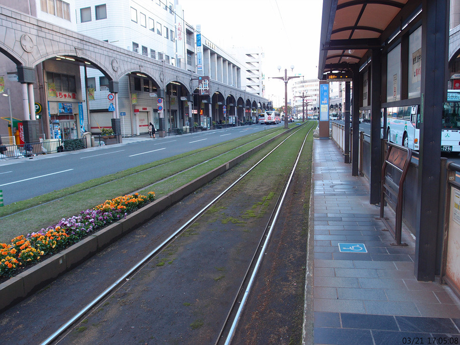 (사진 175) 시덴 1계통이 들어오네요. 여기서 가고시마역 방향으로는 1계통이나 2계통이나 아무거나 타도 되지요.