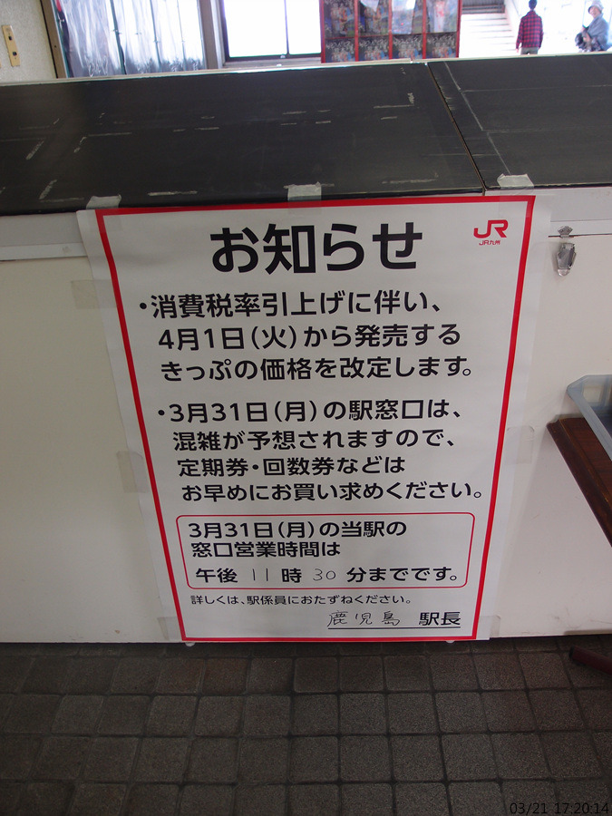 (사진 180) 대부분의 역에 붙어있던 소비세 인상 안내문. 서일본인가는, 31일에는 줄을 서도 시간이 지나면 표를 못살수 있다 라는 안내문도 있었던것 같은데, 여기는 없네요.