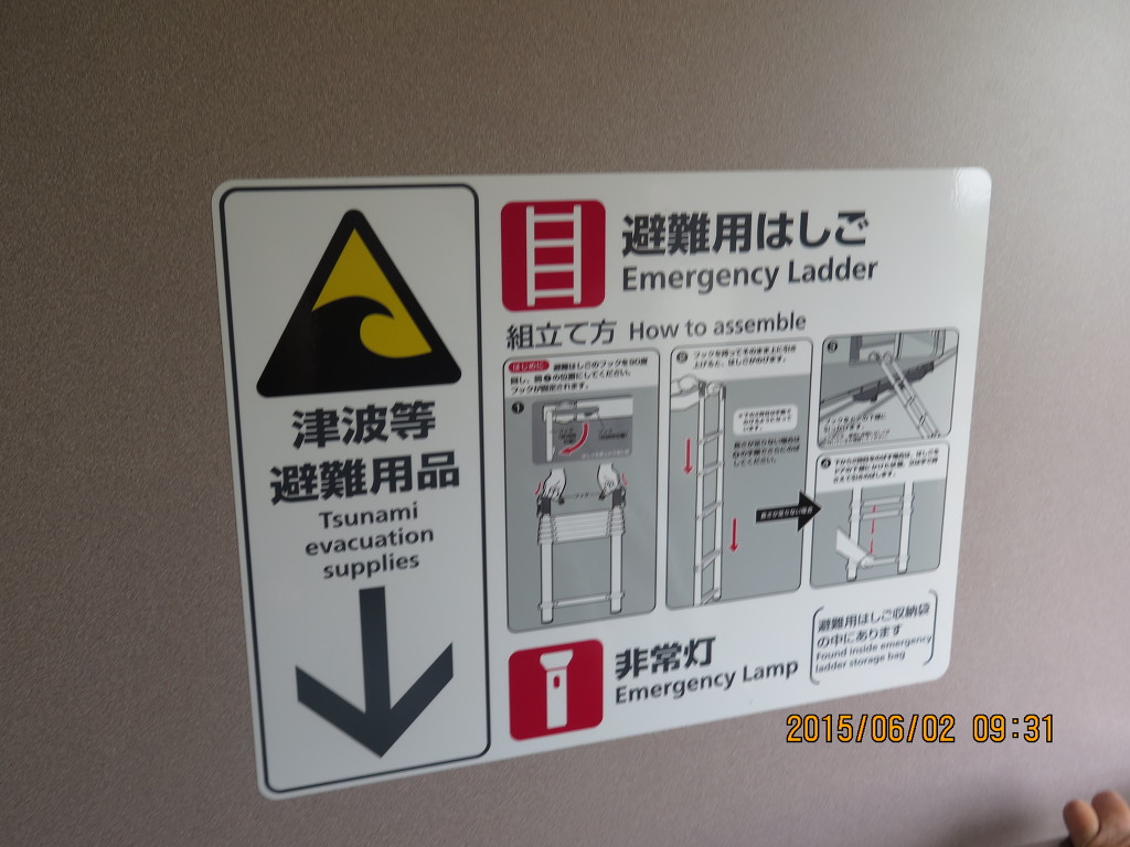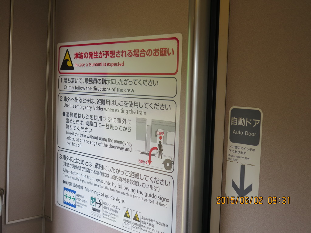 하차를 위해 통로로 나왔는데, 쓰나미가 발생할 경우 쓰는 차량탈출용 사다리가 놓여져 있고 설명도 자세하게 되어 있습니다. 아무래도 해안을 따라 달리는 열차이다 보니 도호쿠대지진 이후 설치한 것으로 보입니다.