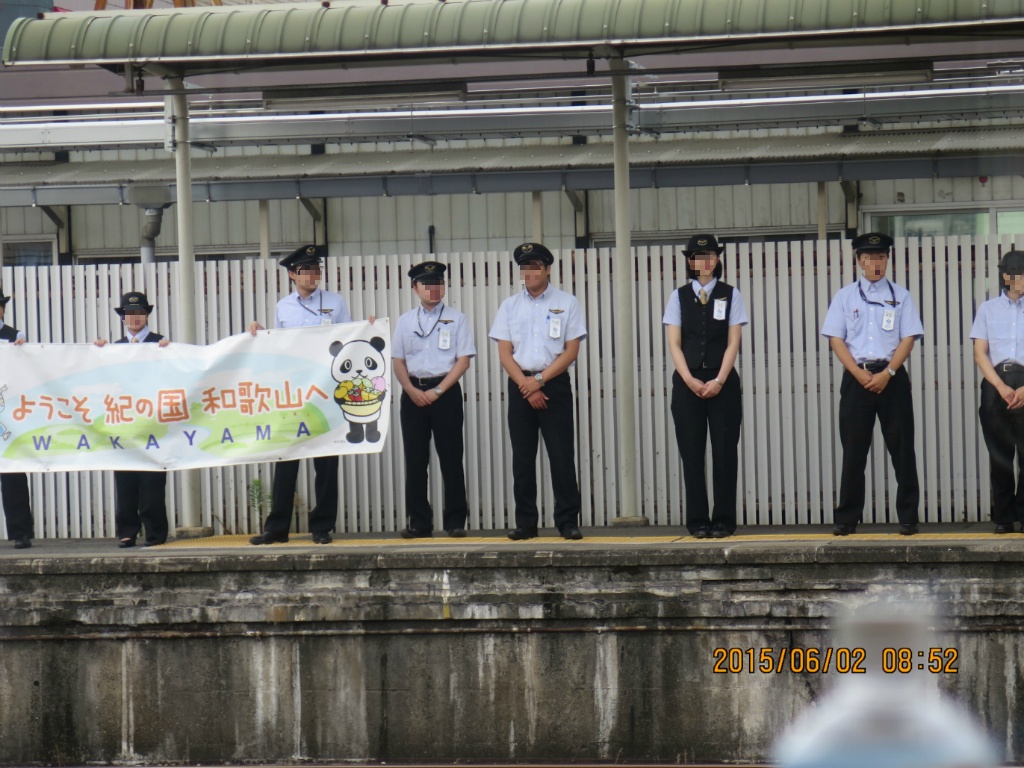 승무원들이 나와서 현수막을 들고 서있는 이 역은 와카야마역입니다. 그래도 와카야마 하면