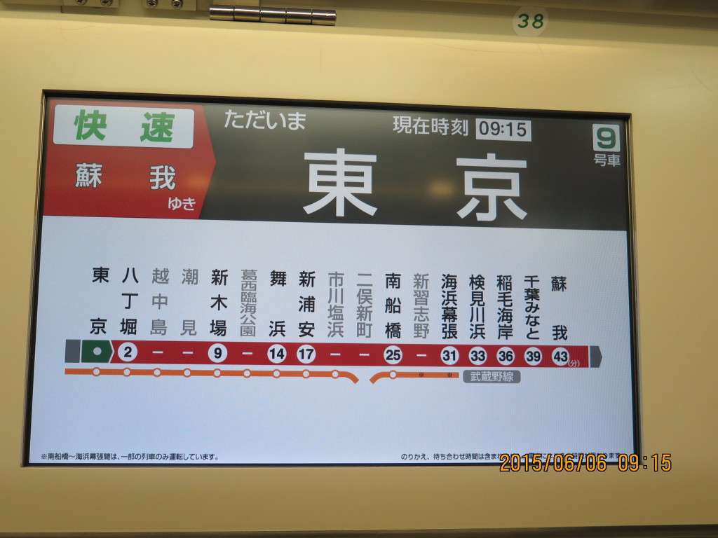 수도권에서는 이제 모니터가 ‘기본 옵션’ 이 된 것 같습니다. 제가 탄 열차는 쾌속열차라 도쿄역 출발 후 핫쵸보리, 신키바, 마이하마, 신우라야스, 미나미후나바시, 카이힌마쿠하리까지 서고 이후 종착역인 소가까지 각역정차합니다. 각역정차로 가면 57분, 쾌속은 43분이 걸려 서 갑니다.