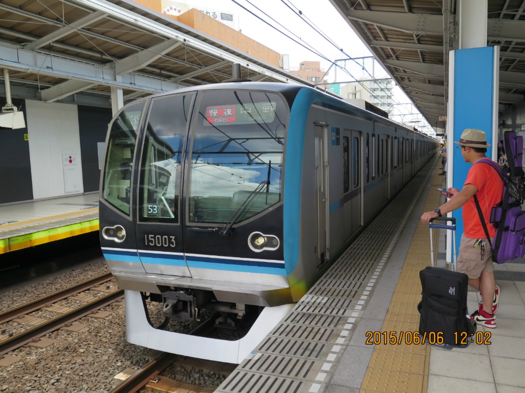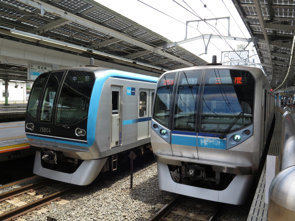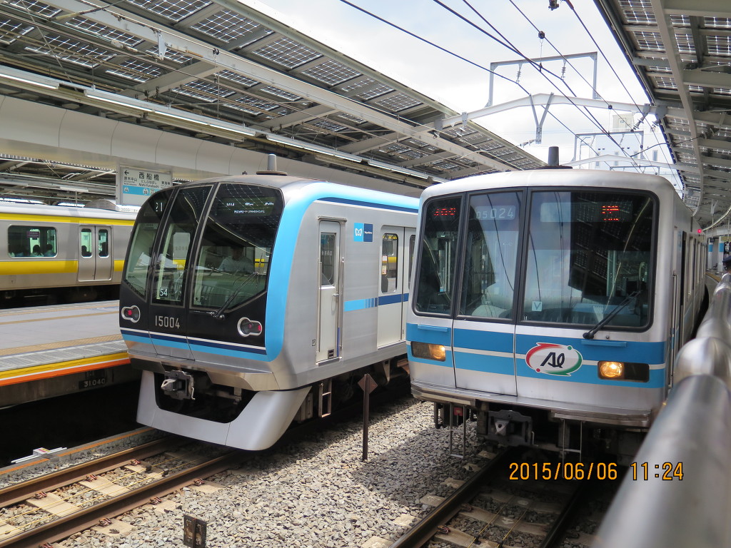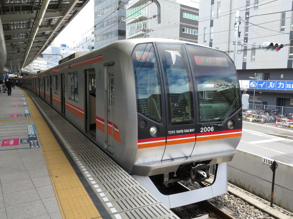 쾌속 나카노행 15000계입니다. 도자이선은 지하철 노선으로는 드물게 쾌속운전을 하는데, 나카노~도요쵸간 각역정차하고, 이후 우라야스에만 정차한 후 니시후나바시로 갑니다. 도요고속선으로 직통하는 열차는 니시후나바시 이후로 각역정차합니다. 제가 내릴 카사이역에는 쾌속열차가 서지 않지만, 출근시간대 나카노방면으로만 운행하는 통근쾌속은 정차합니다. 이 통근쾌속의 경우 니시후나바시~우라야스간 무정차, 우라야스 이후 각역정차합니다.