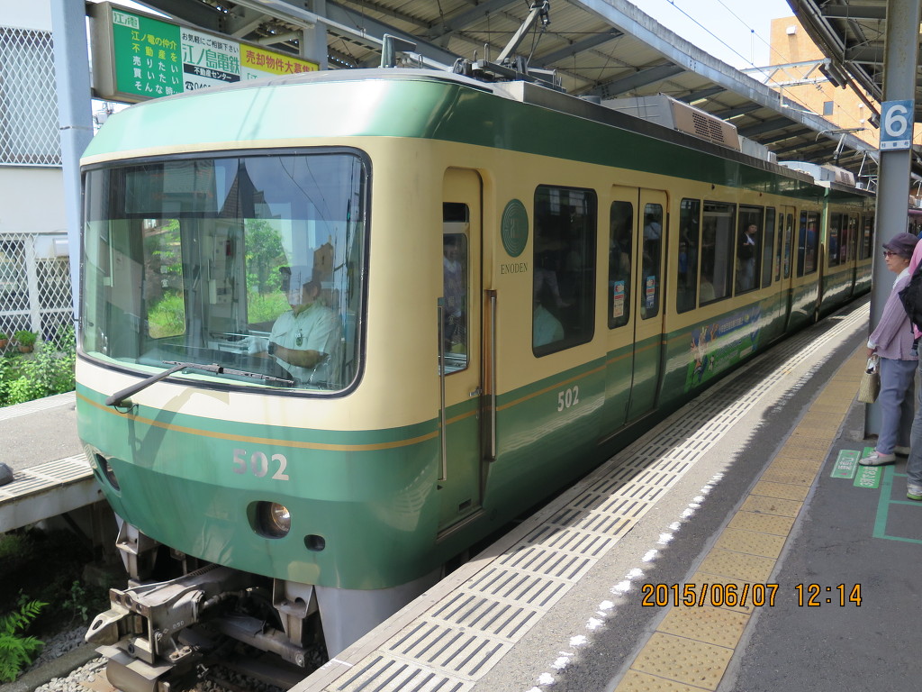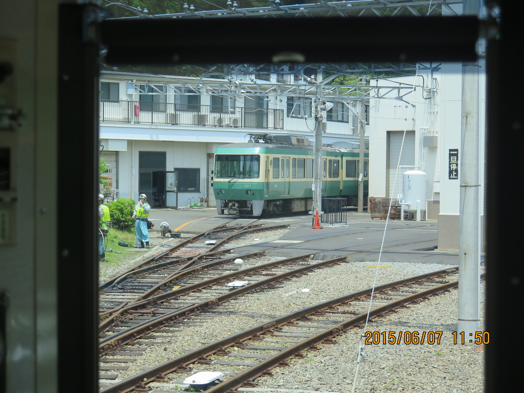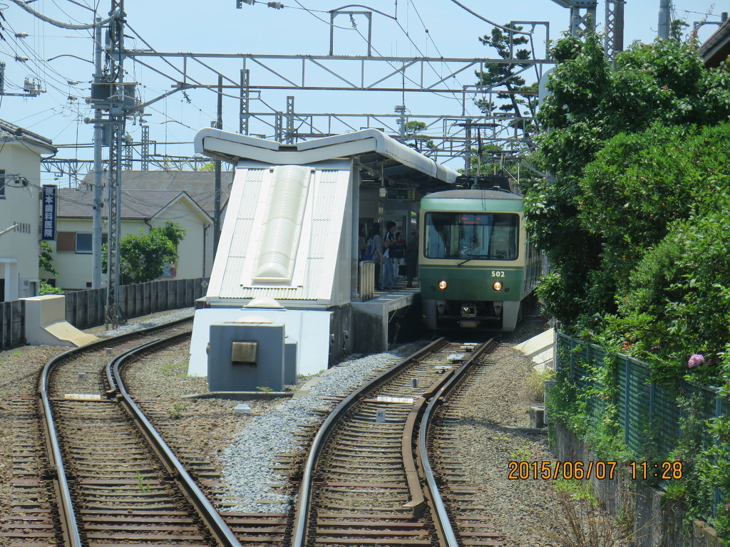 고쿠라쿠지역을 앞두고 에노덴의 차량기지가 나옵니다. 500계 한편성이 쉬고 있는데요, 단선이라 열차를 모두 투입해도 한계가 있을 것 같습니다. 주말 배차간격은 12분입니다.