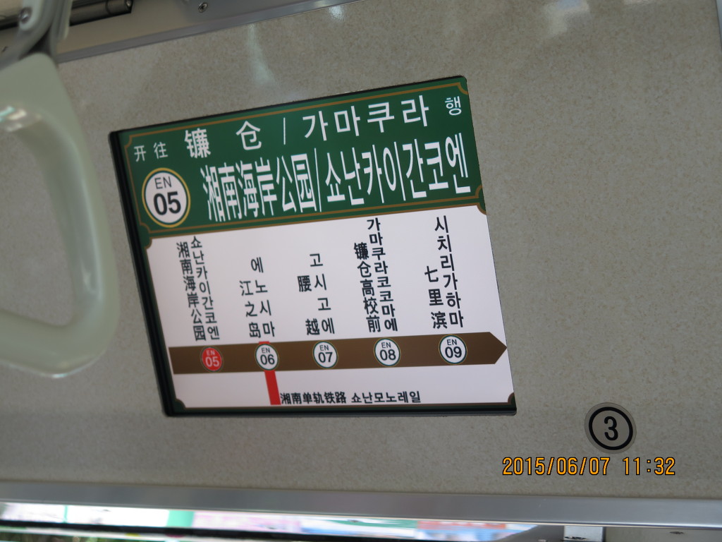 에노덴에도 모니터가 달려있습니다. 500계의 경우는 순정일 것 같은데 지금 제가 타고있는 1200계는 연식으로 봤을 때 따로 개조를 한 것 같습니다. 일본 뿐 아니라 해외 관광객들이 많이 오는 동네이기 때문에 중국어/한국어 모두 대응 가능합니다.