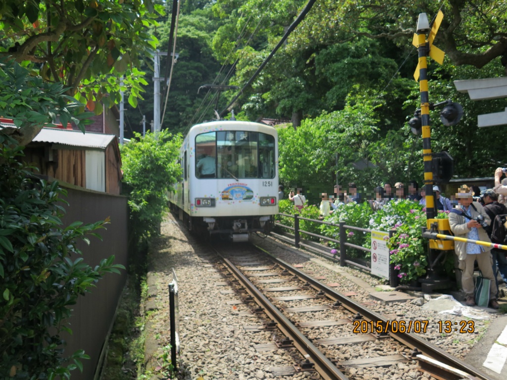 바로 이게 제 목적입니다. 고쿠라쿠지 터널을 빠져나오는 에노덴 차량을 찍는게 목적이었습니다. 저 말고도 이렇게 사진 찍으려는 사람들이 많아서인지 안전요원분들이 상당히 많았습니다.