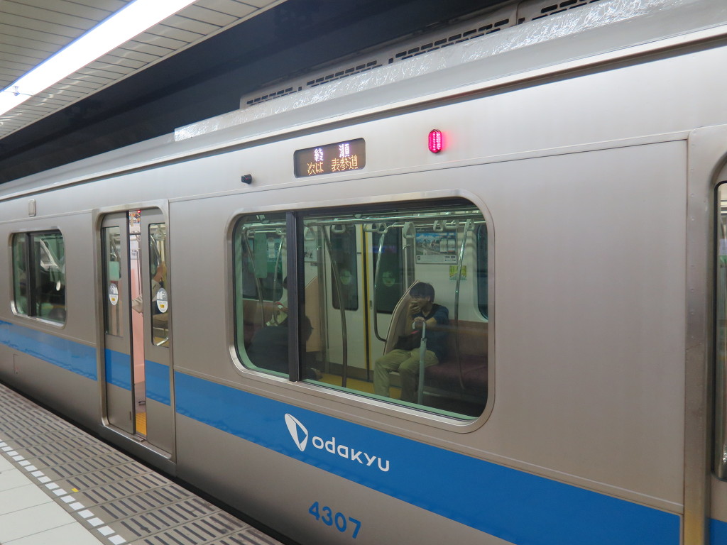이 사진을 끝으로 카메라 배터리가 방전되었습니다. 아야세행 오다큐 4000계입니다. 다행히 차내에 사람이 많이 없어서 앉아 올 수는 있었습니다.