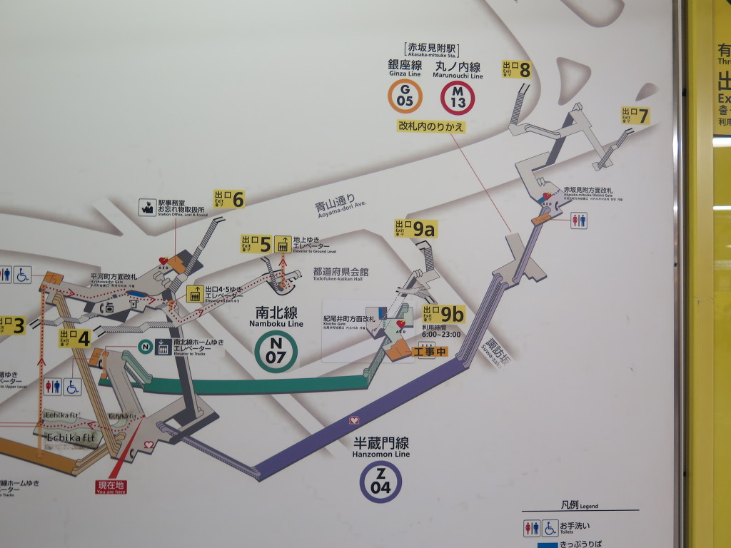 대략적인 환승 안내도입니다. 여기서 긴자선/마루노우치선으로 갈아타려면 한조몬선 승강장을 완전히 가로질러서 가야하고, 더 골때리는건 '나가타쵸역'이 아닌 '아카사카미츠케'역과 환승이 된다는 점입니다. 환승 거리만 거의 650m.