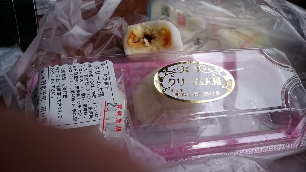 이즈모야시로 역에서 파는 '테나즈치 마을 크림 다이후쿠'입니다. 달콤한 커스타드와 씁쓸한 캐러멜을 딱딱하진 않을만큼 얼려서 굳힌 뒤 찹쌀떡으로 감싼 화+양과자. 간단히 말해 찹살떡 안에 커스터드 푸딩이 들었다고 생각하시면 됩니다..^^; 3개 400엔.