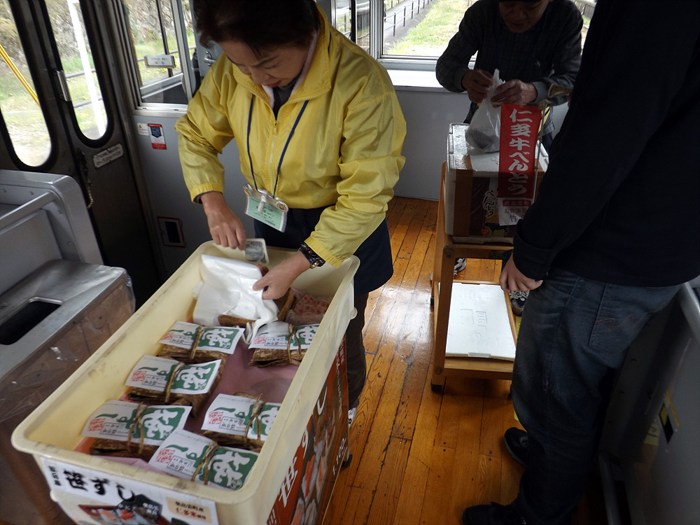정차시간이 1분 밖에 안되는 역이라 어떻게 차내판매를 하나 싶었는데, 토롯코 열차라고 창문 밖에서 바로 건네주고 돈받는 차외판매(?)를 시전하더군요..^^;