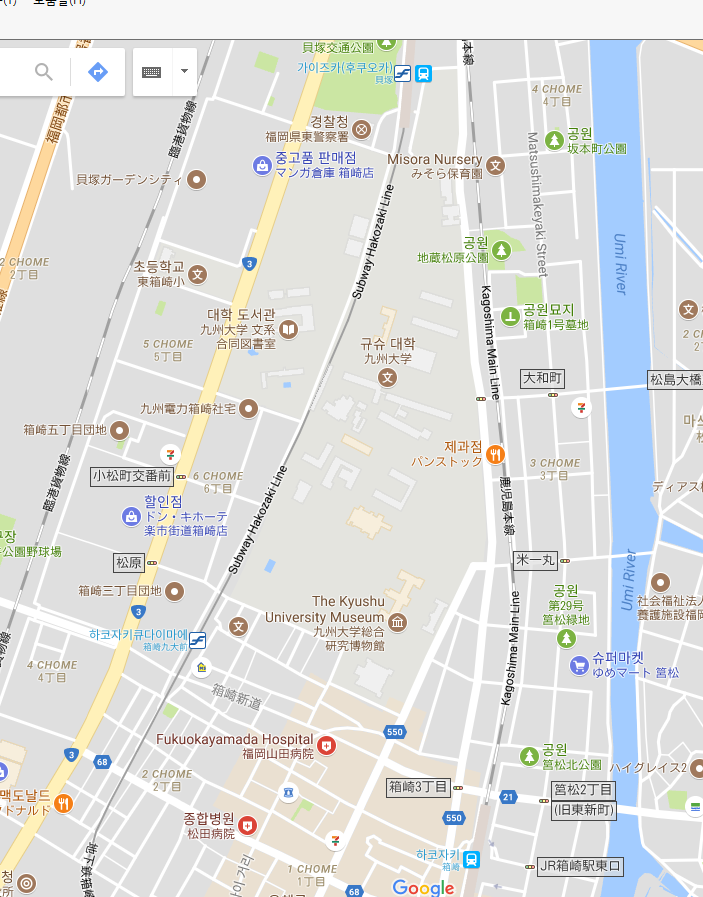 지도로 보면 가이즈카역에서 살짝 더 가까운데요, 절대 거기로는 가지마시고 하나 아래 하코자키큐다이마에나 JR하코자키역으로 접근하시기 바랍니다. 왜냐하면요;;