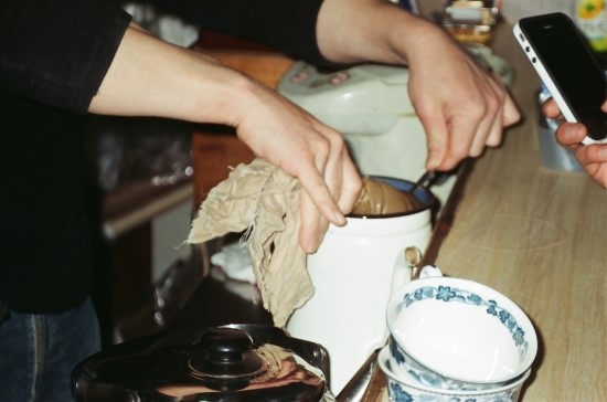 팬에다가 커피를 끊여서 면 보자기에 커피를 붓고 마치 한약을 짜듯이 커피를 짜냅니다