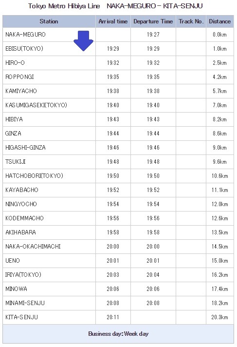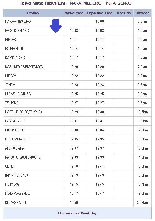 에비스역 (19:13) -> 나카메구로역 (19:15) - 도쿄메트로 히비야선 보통 (A1827T) [1km]