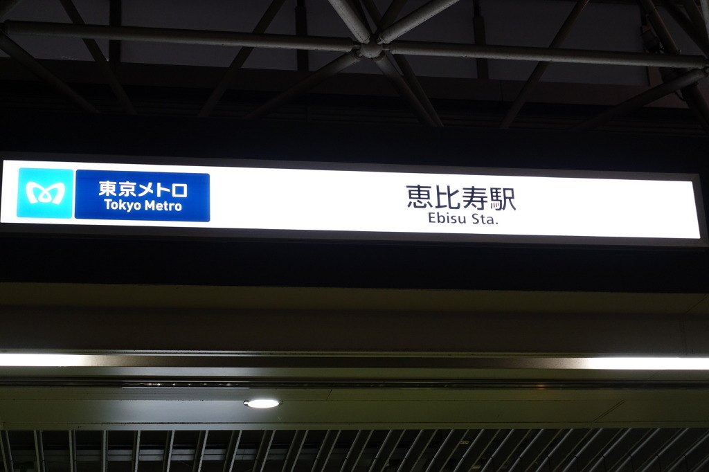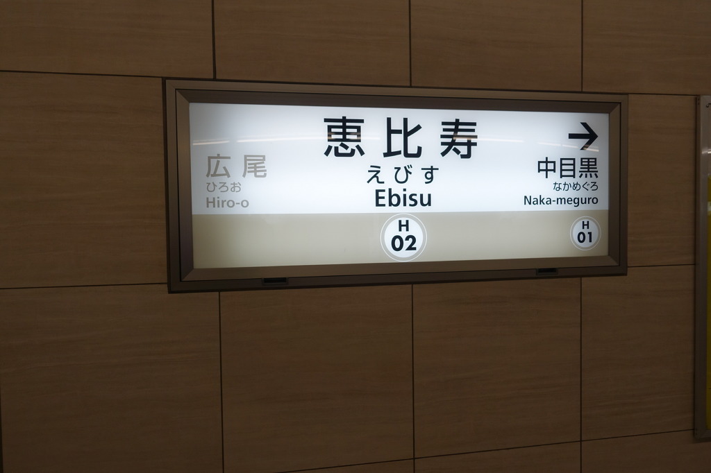 <사진 0159 : 도쿄메트로의 에비스역 역명판. JR의 것보다는 좀 더 깔끔한편입니다.>