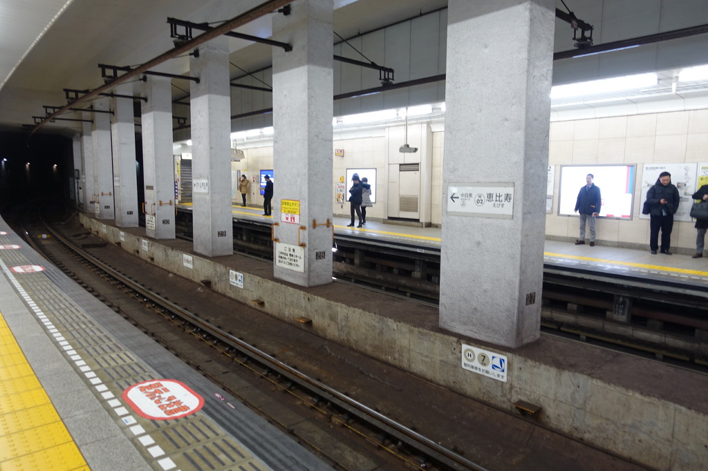 <사진 0145 : 도착한 에비스역. 약간 굽어있는 평범한 상대식 승강장입니다.>