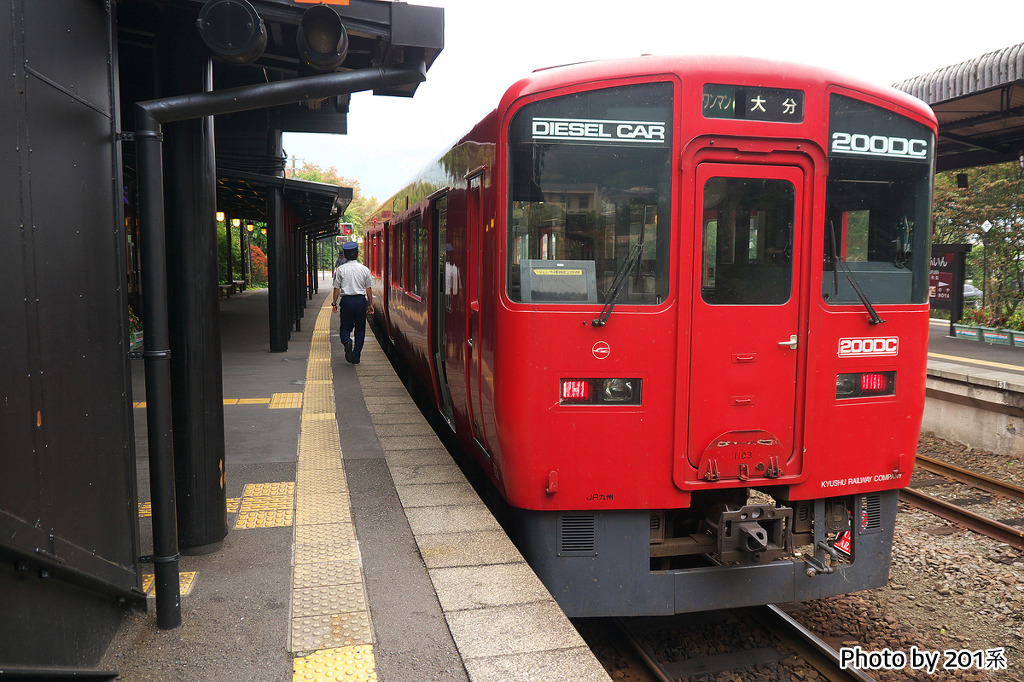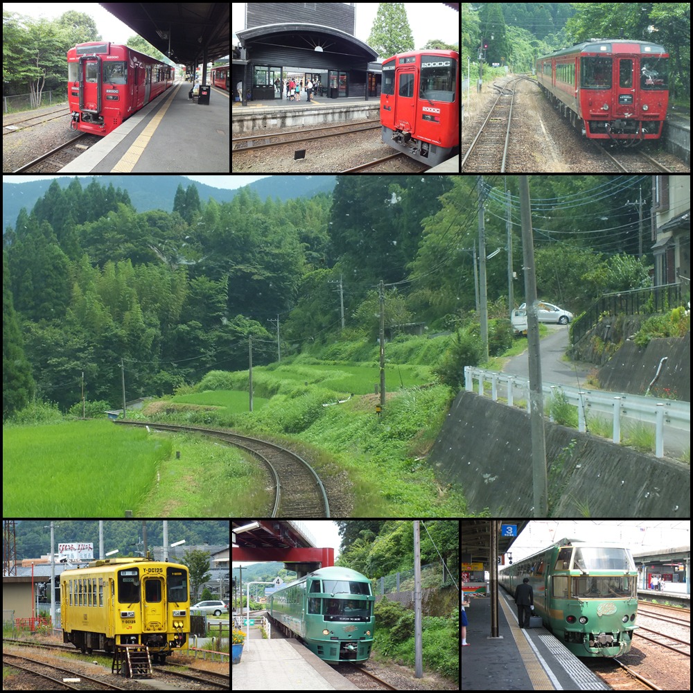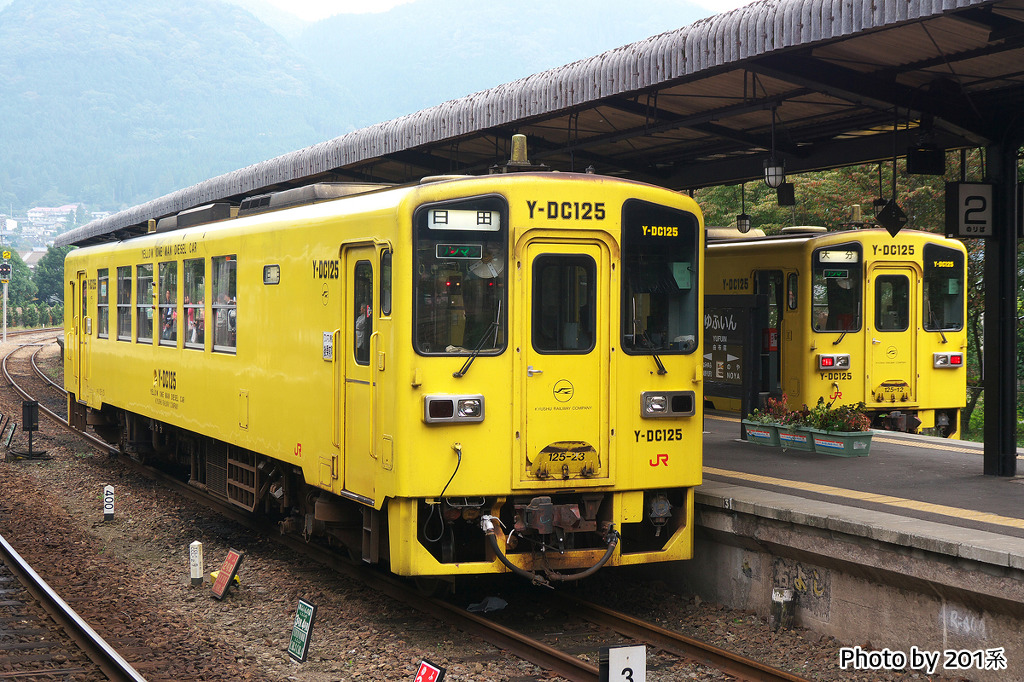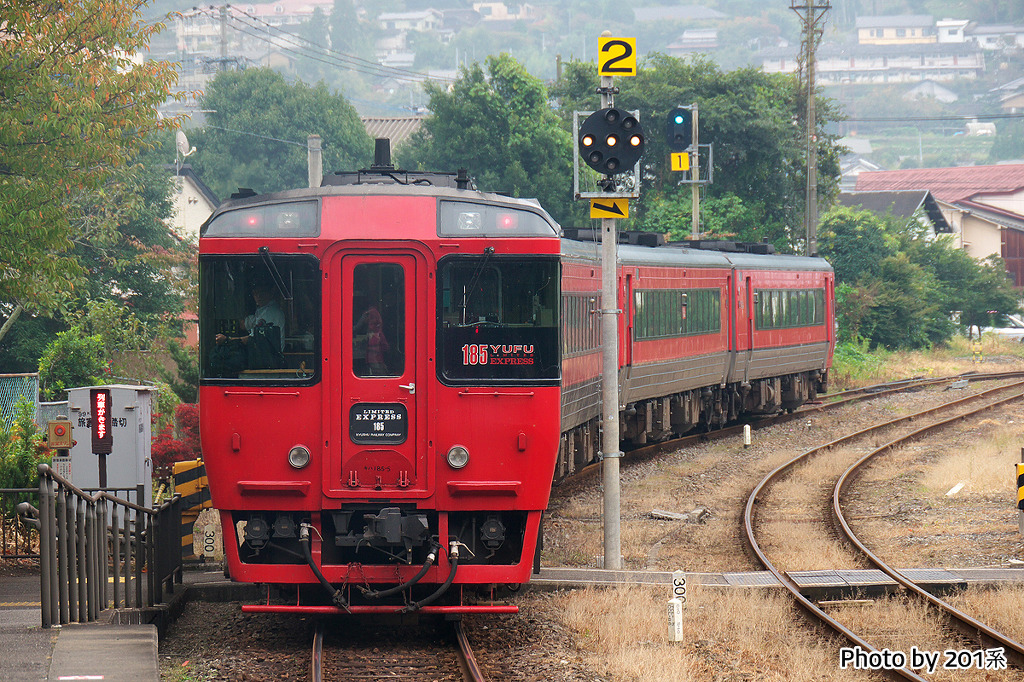 특급 유후인노모리/유후 - 특급 유후는 1992년 7월 15일부터 운행을 개시했으며, JR시코쿠로부터 구입한 키하185계 디젤기동차를 투입하여 기존 급행을 특급으로 승격하여 운행을 개시하였다. 특급 유후인노모리는 1989년 3월 11일부터 운행을 개시한 관광열차로, 큐슈의 다양한 관광열차의 효시가 된 열차이다.