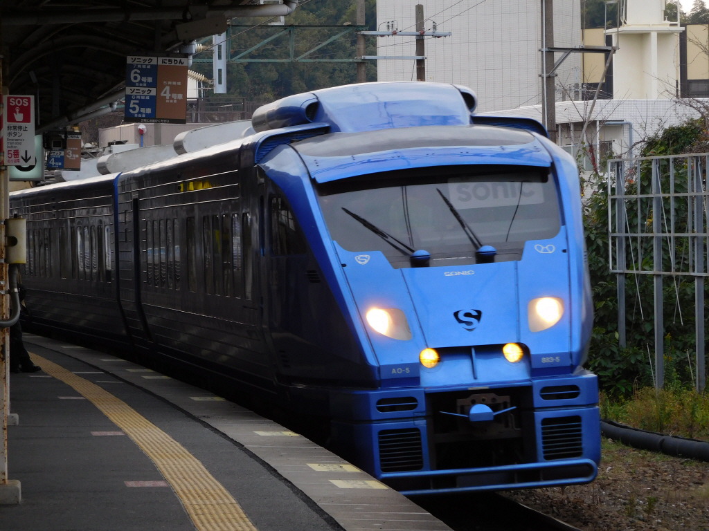 특급 소닉 - 하카타~사이키 구간 1왕복, 하카타~오이타 구간 29왕복, 하카타~나카츠 구간 1왕복, 나카츠~오이타 구간 1왕복으로 운전된다. 낮시간대에는 항상 하카타~오이타 구간에서 시간당 2회 운행을 하고 있으며, 속달편은 약 2시간, 정차타입은 2시간 15분 정도로 하카타~오이타 구간을 연결하고 있다. 특히 성수기에는 열차의 증편이 행해져 883계/885계 이외의 차량도 특급 소닉으로 운용되는 경우도 있다. 특급 니치린과 벳부/오이타역에서 연계되어 바로 환승이 가능한 열차도 운행된다. 883계는 7량편성, 885계는 6량편성이며, 1호차 일부는 그린샤로 운영된다.