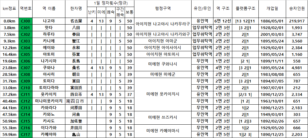 단선/복선구분 : 나고야~사사지마신호장, 야토미~쿠와나간, 토미타하마~욧카이치구간, 미나미욧카이치~카와라다 구간은 복선, 나머지는 단선