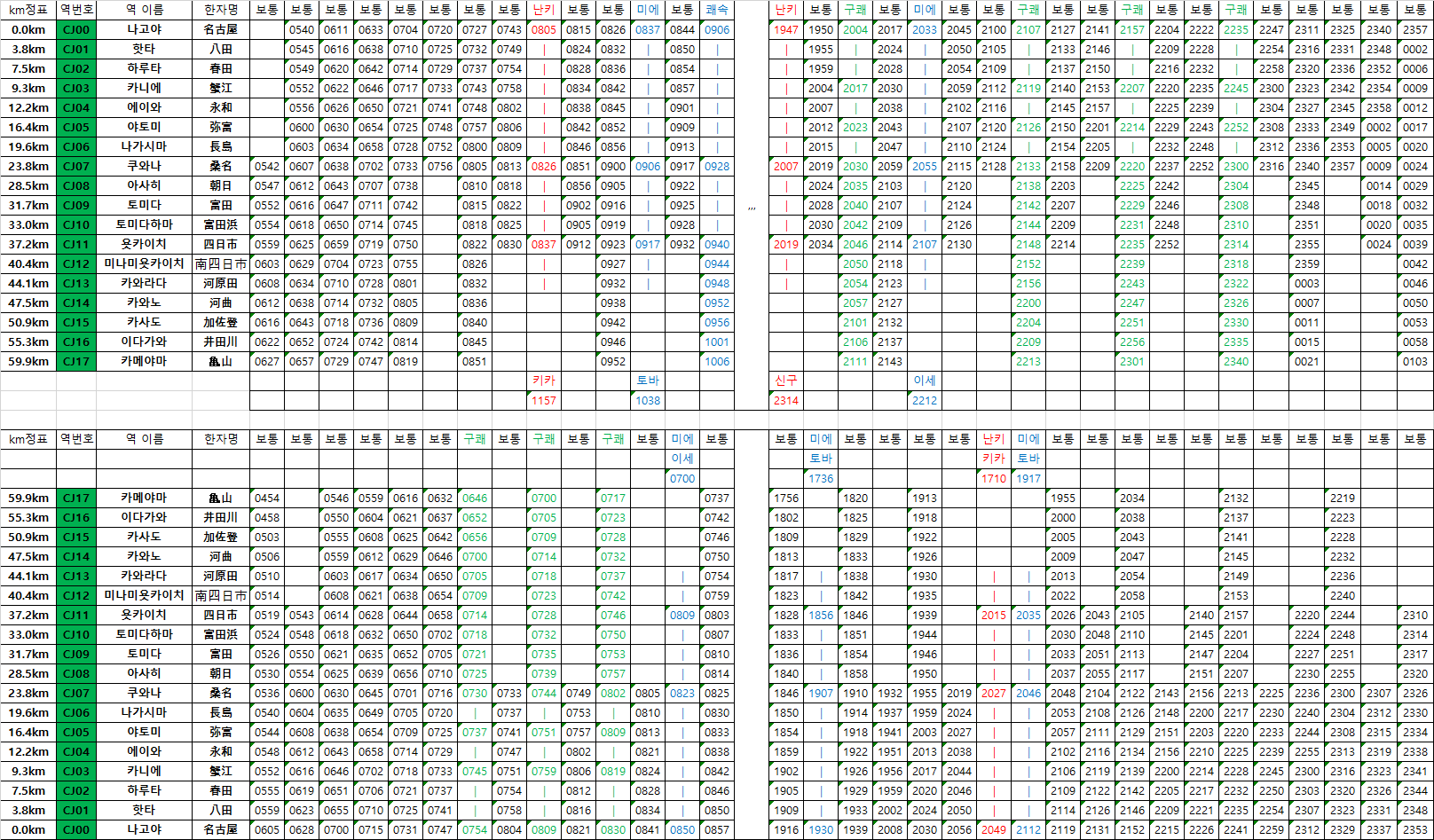 열차 운행등급 : 특급 난키/쾌속 미에/구간쾌속/보통열차