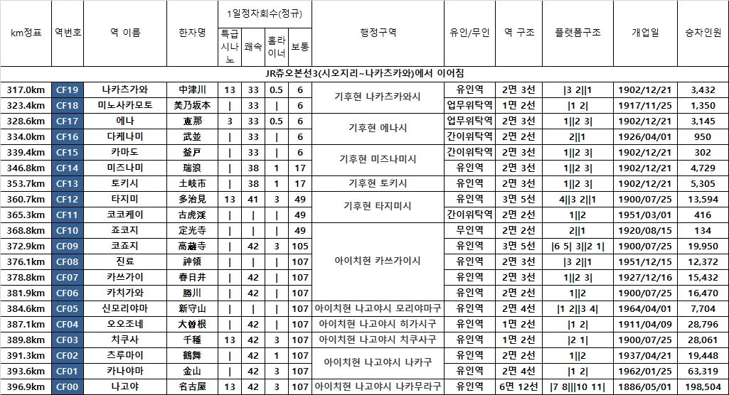 영업 km : 79.9km(나카츠카와~나고야)(시오지리~나고야간 : 174.8km)