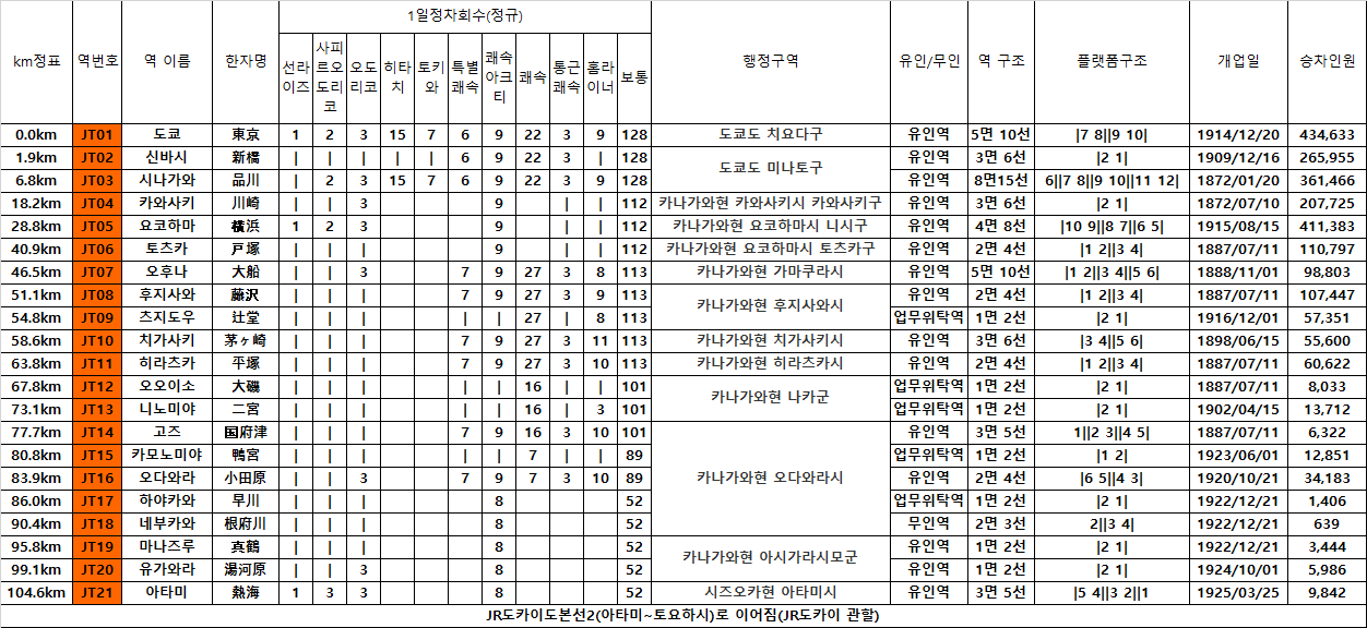 단선/복선구분 : 도쿄~오다와라간 복복선, 오다와라~아타미간 복선