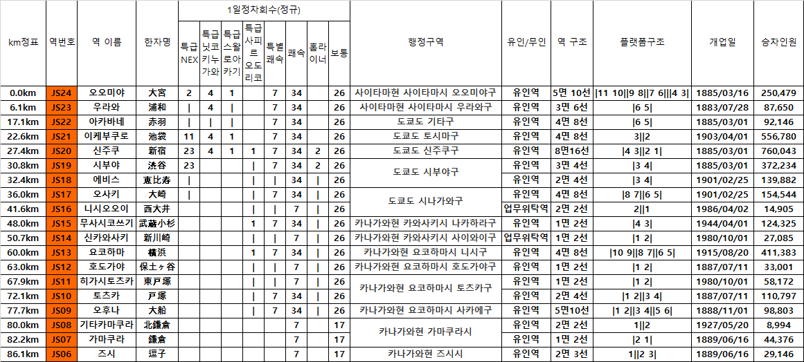 사이쿄선-소테츠 직통열차 - JR동일본 측에서는 사이쿄선 및 카와고에선으로 직통하는 열차의 일부로 취급하며, 신주쿠 이북에서는 쾌속 및 통근쾌속으로 운행되는 열차도 있지만, 신주쿠 이남 구간에서는 모두 각역정차를 하므로 전 열차가 각역정차로 안내된다. 소테츠 내에서는 특급과 각역정차가 운행되는데, 특급은 소테츠선 내에서는 도중 후타마타가와역과 야마토역에만 정차하며 각역정차는 각 역에 모두 정차한다. 1일 총 운행회수는 46왕복인데, 23왕복은 특급, 23왕복은 각역정차이고, 하자와요코하마코쿠다이 발착의 각정열차가 1왕복 운행된다. 평상시에는 신주쿠역 2번홈에서 되돌림 운행을 하지만, 출퇴근시간에는 되돌림 운행을 할 플랫폼 자리가 나오지 않는 관계로 카와고에선/사이쿄선 직통운행을 하는 열차도 있어 에비나~카와고에 구간의 장거리 운행도 있다. 열차번호는 신주쿠역에서 바뀐다. 평일 출퇴근시간대에 집중 배차되어 시간당 4편, 평시에는 시간당 2편으로 운행한다. 출근시간대의 상행열차는 모두 특급으로, 속달성을 확보하고 있다. 평시에는 특급과 각역정차가 교대로 운행한다. 도카이도화물선을 공유하므로, 화물열차를 운행하는 JR화물과의 시각표 조정이 필요하며 쇼난신주쿠라인과의 열차 운행회수 조정관계로 평시에는 운행회수가 적다. 무사시코스기역의 상습 혼잡 관계로 요코스카선/쇼난신주쿠라인 환승객은 니시오오이역 환승이 권장되고 있다. 아침 출근시간대에는 카와고에 방향 선두차량에 여성전용차가 설정된다. 새로운 직통운행 사례이므로 운임 계산에 있어서 다양한 특례가 존재한다. 특히 오사키~츠루미~하자와요코하마코쿠다이역 구간의 운임계산은 시나가와/오오이마치역 경유 거리로 계산하게 된다. 또한 하자와요코하마코쿠다이역의 경우 요코하마시내 발착 승차권의 사용이 허용되며, 구간외 승차가 특례로 허용되는 경우가 있다.
