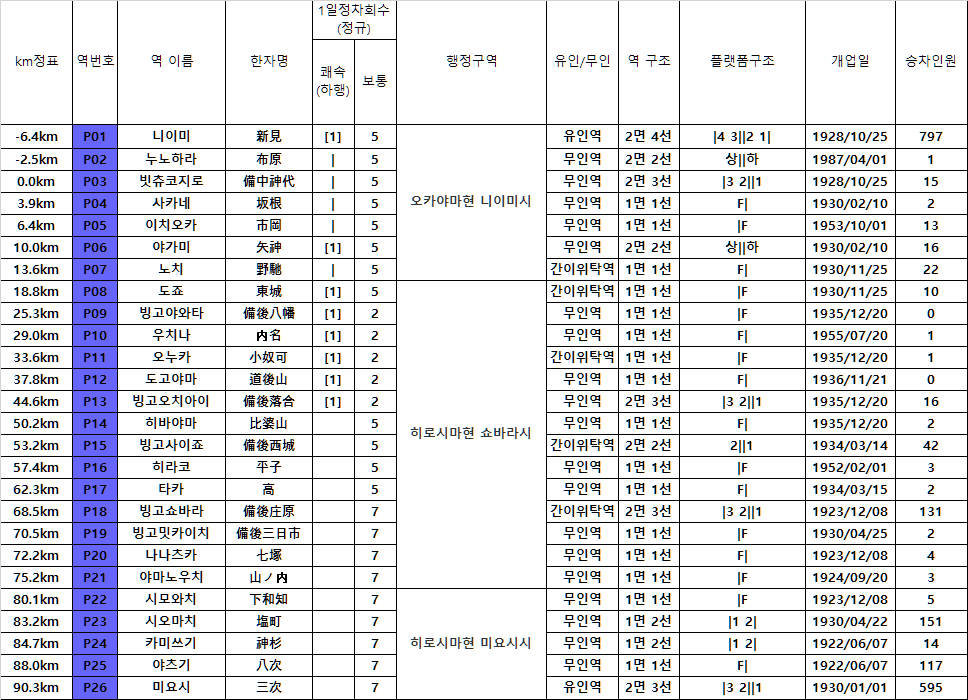 2007/09/01 - 빗츄철도부 폐지로 인해 빗츄코지로~빙고오치아이 구간이 오카야마지사 직할 구간이 됨.