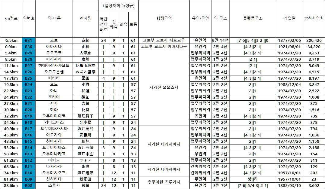 역수 : 21개 역(야마시나~오우미시오츠)