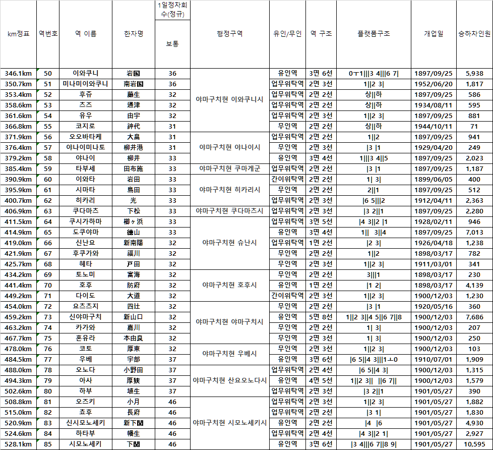 1995/10/01 - 이와쿠니~요츠츠지 구간은 히로시마지사 관할의 도쿠야마지역철도부가 관할, 요츠츠지~시모노세키 구간은 시모노세키지역철도부가 관할하게 됨.