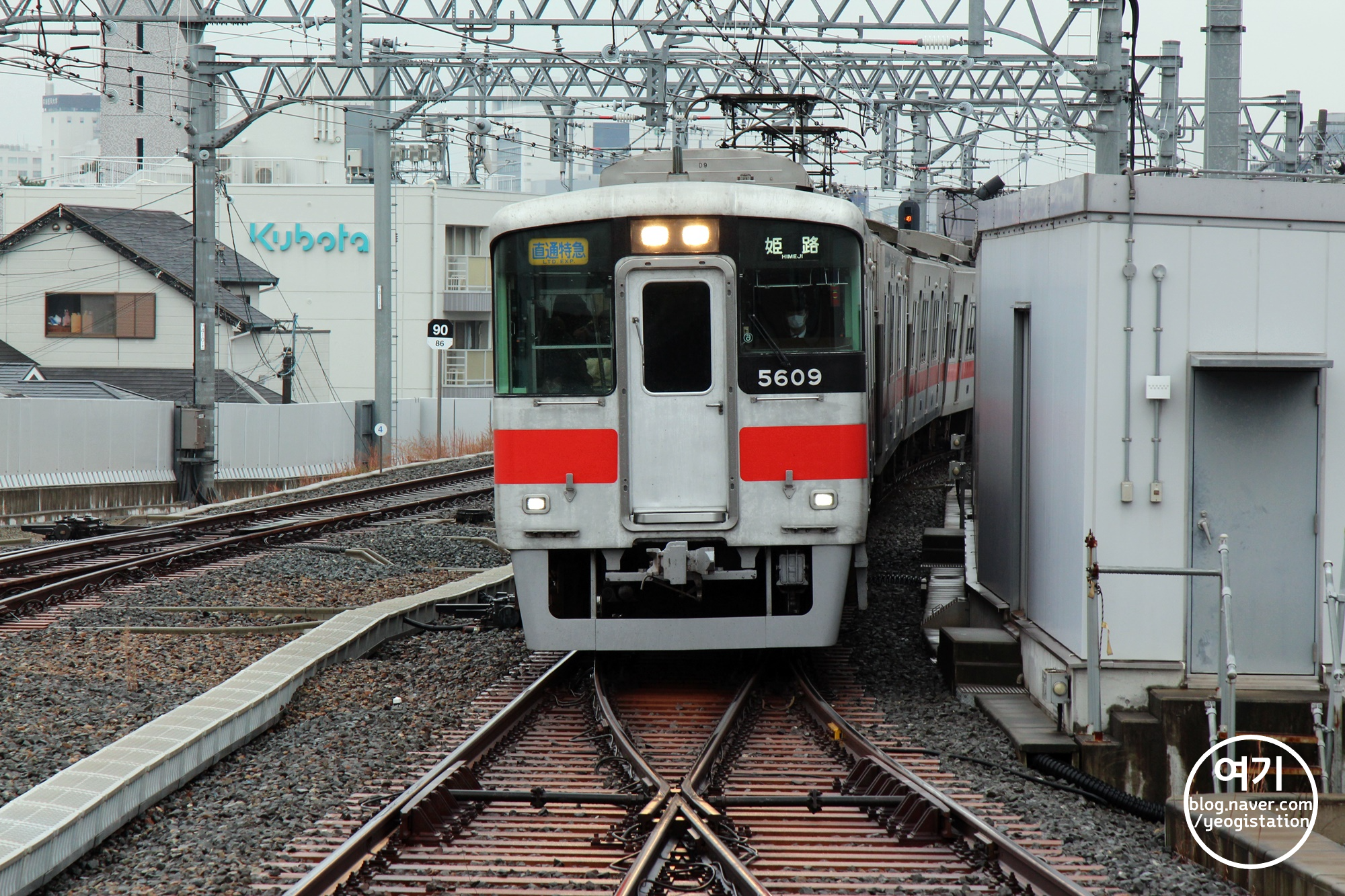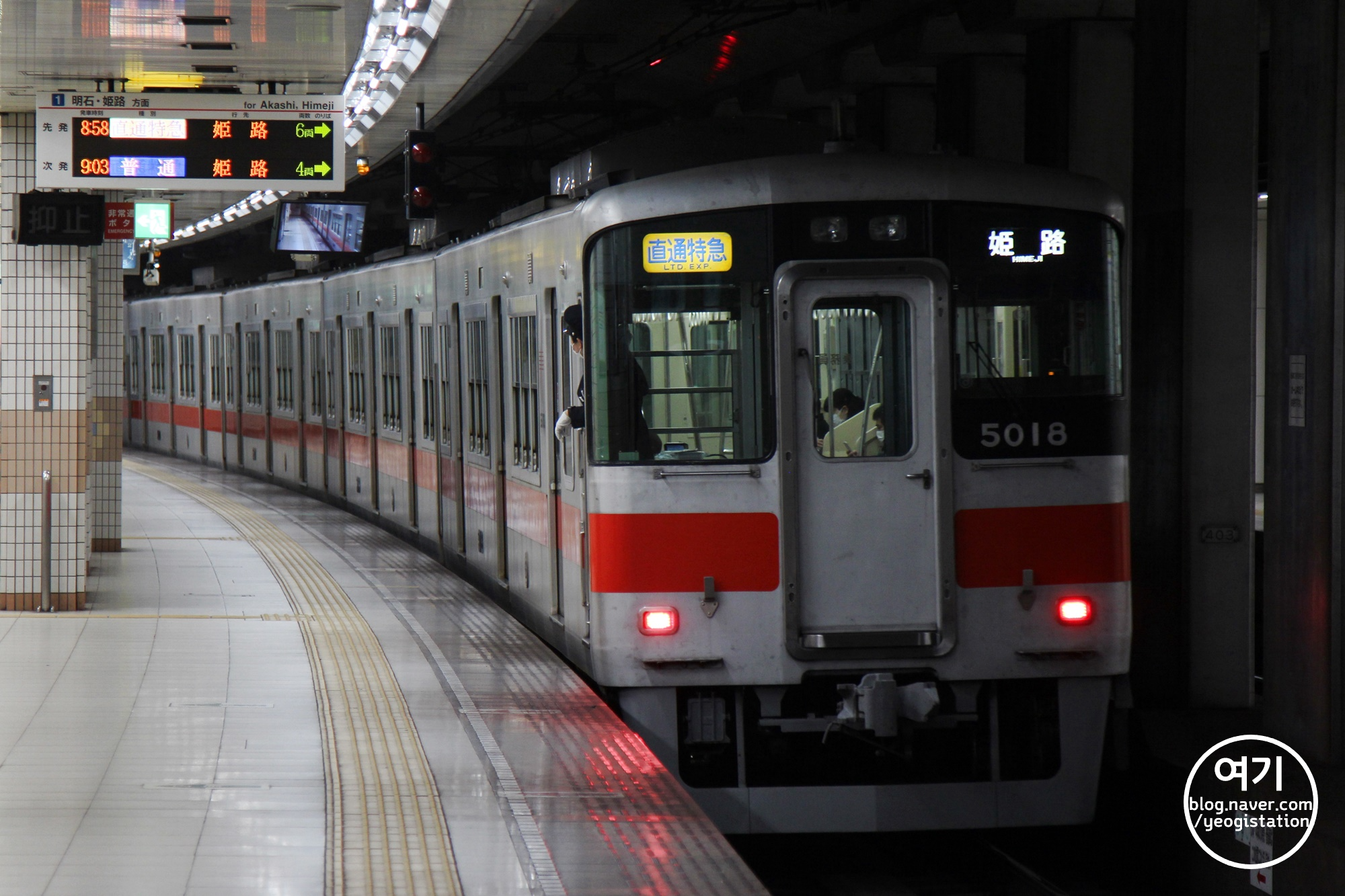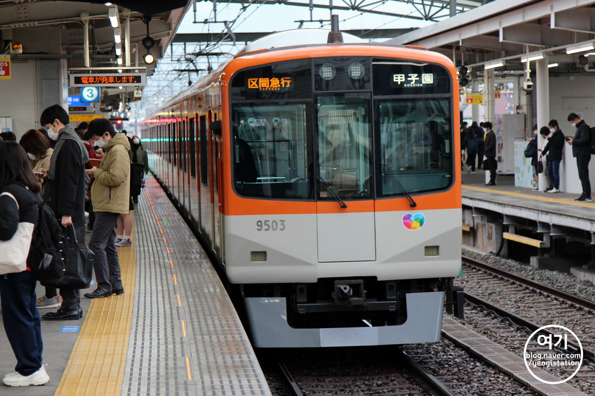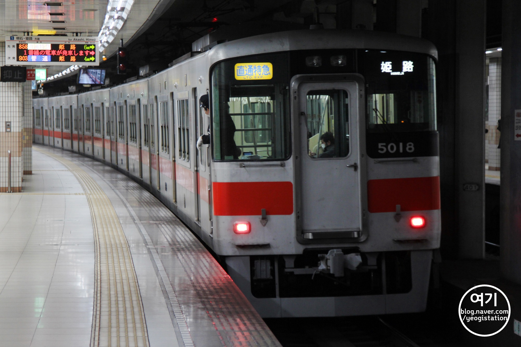 안타깝게도 코시엔역에서의 머무름은, 바로 뒤로 후속열차인 산요 전기철도 본선(山陽電気鉄道) 직결 산요히메지(山陽姫路)행 직통특급열차가 들어온 관계로 금방 마무리됩니다. 차량도 한신이 아닌 산요 전기철도(山陽電気鉄道)라는 사철 회사의 소속인 5000계 전동차인데요. 순간 특급이라고 해서 내가 그냥 타도 되나...? 싶었지만 타도 됩니다.